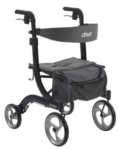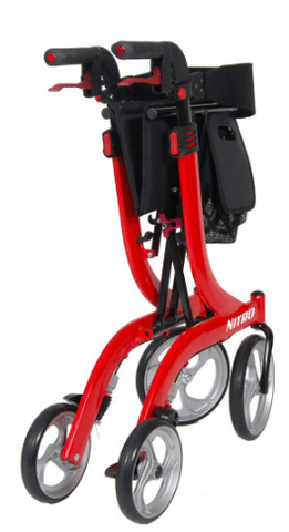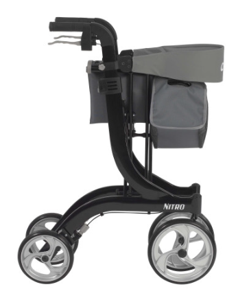 Cet ambulateur est intelligemment conçu avec un siège confortable, un sac de rangement pratique, des poignées réglables en hauteur et de grandes roues avant de 10 pouces pour un roulement fluide. Avec les câbles de frein à l'intérieur du cadre léger, l'ambulateur offre une expérience sûre lorsque vous êtes en déplacement. Avec la possibilité de se plier latéralement, l'ambulateur Nitro peut facilement se transporter et être rangé. La hauteur de la courroie de dossier est réglable pour un confort amélioré.